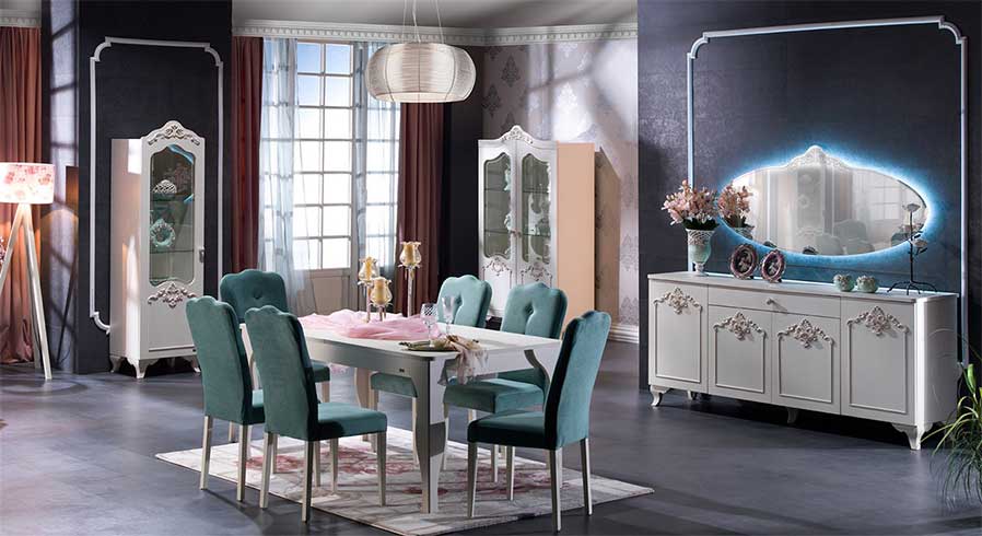 Yemek odası takımı söz konusu olduğunda görkemli klasik konsollar, Mydafne tasarımcıları tarafından mekana uygun olarak tasarlanıyor. Odalara muhteşem bir yeni görünüm kazandıran yemek odası konsolları , eşyalarınızı yerleştirebileceğiniz bölme özellikleri ile fonksiyonel bir yapıya sahiptir. Gravür ile üretilen klasik yemek konsolları her model ile farklı modellerde çalışmaktadır. Yemek odalarının bir diğer parçası olan klasik vitrinler de konsollar gibi mekana değer katar. Kişiye göre değişiklik gösteren birçok seçenek ile üretilebilen konsol ve vitrin modelleri, tek olmakla birlikte ekiple birlikte seçilebilir.